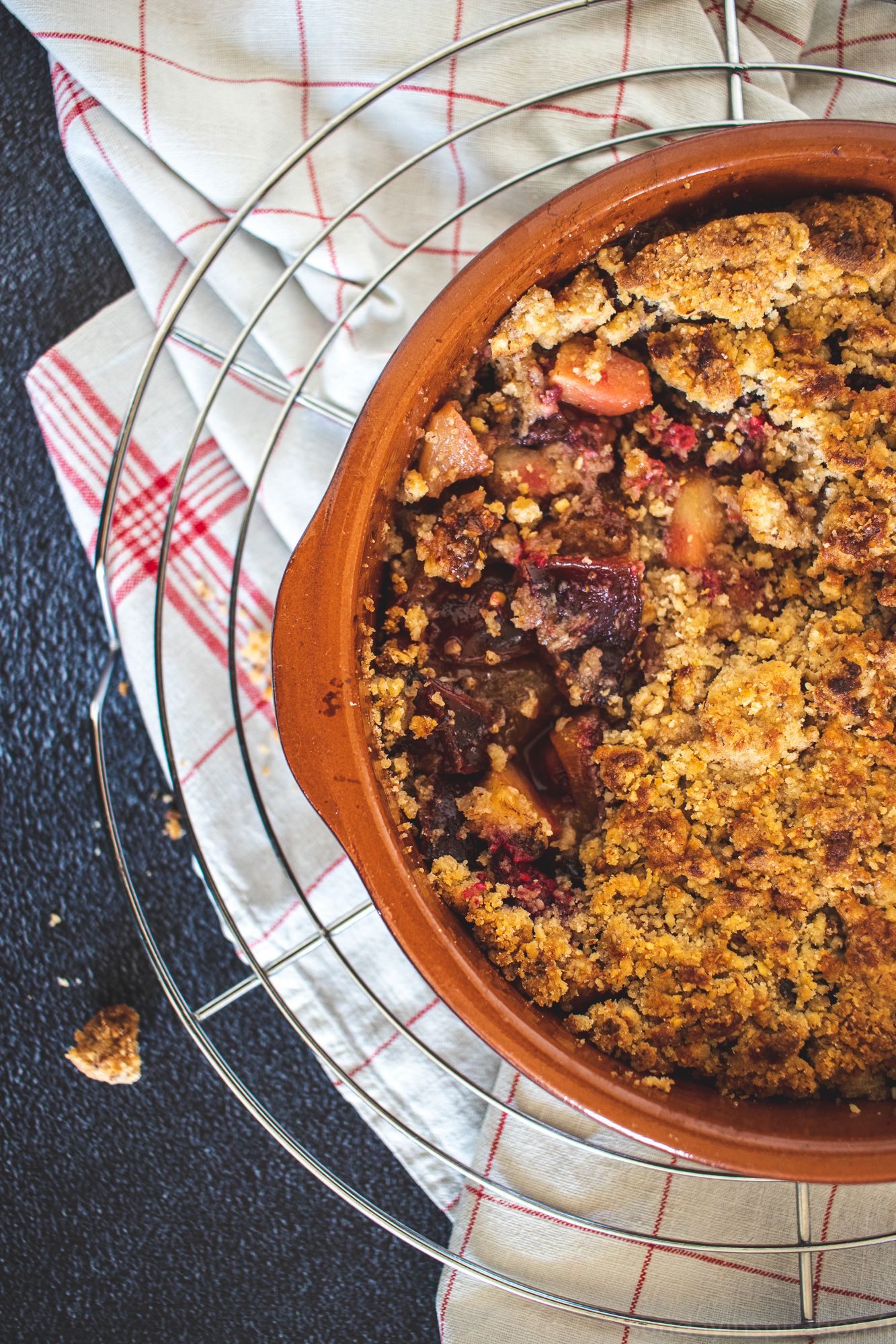 Normalerweise mache ich jedes Jahr eine Questche und Spekulatius-Torte. Aber dieses Jahr habe ich mich für was anders entschieden und habe einen Crumble gebacken. Crumble ist eine Nachspeise, die ich besonders gerne mag. Er ist schnell und einfach zuzubereiten, benötigt nicht viele Zutaten und kann vor allem auf unendlich viele Arten zubereitet werden. Sie können die Kombination von Früchten Ihrer Wahl wählen und den Teig kann mit Kakao, Mandel- oder Haselnusspulver, Spekulatius und vielem mehr verschönert werden.